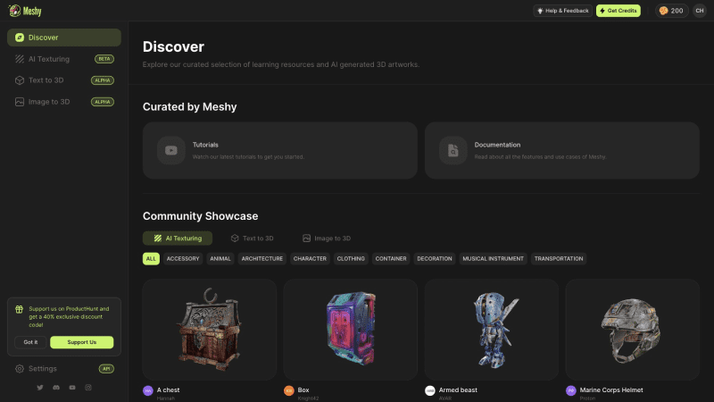- AI图像到3D转换:通过简单的图像输入,Meshy 可轻松将你想要的 2D 物体图像转换为 3D 立体模型。