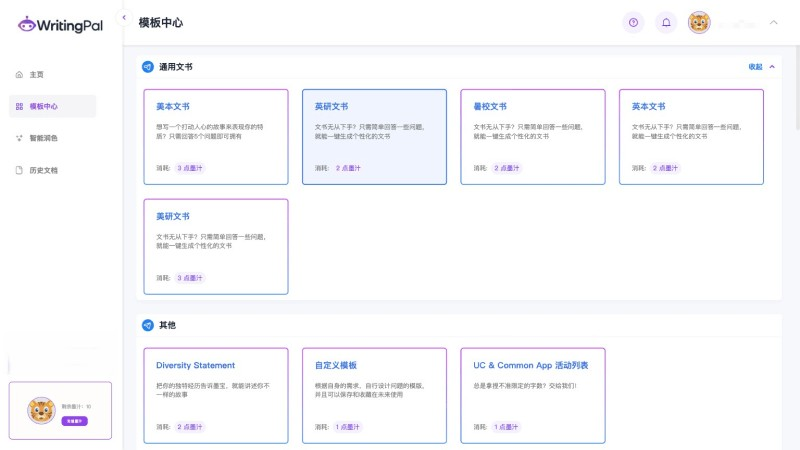 - 开箱即用的模板:平台内置丰富的文书模板,使用中文或英文输入基本个人背景信息,WritngPal墨宝即可帮你快速生成高质量个性化文书,如美本、英研、暑校、求职信、UC申请等。