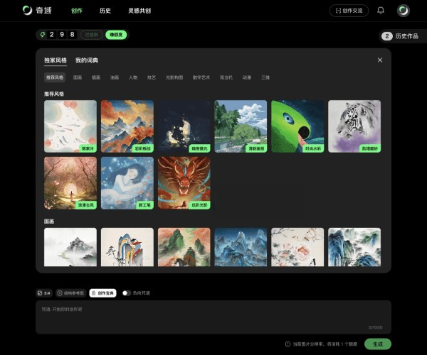 - 多样化风格模板:平台提供了丰富的风格咒语模板,包括传统国画、水墨画、现代插画、技艺等,帮助用户快速选择并开始创作。