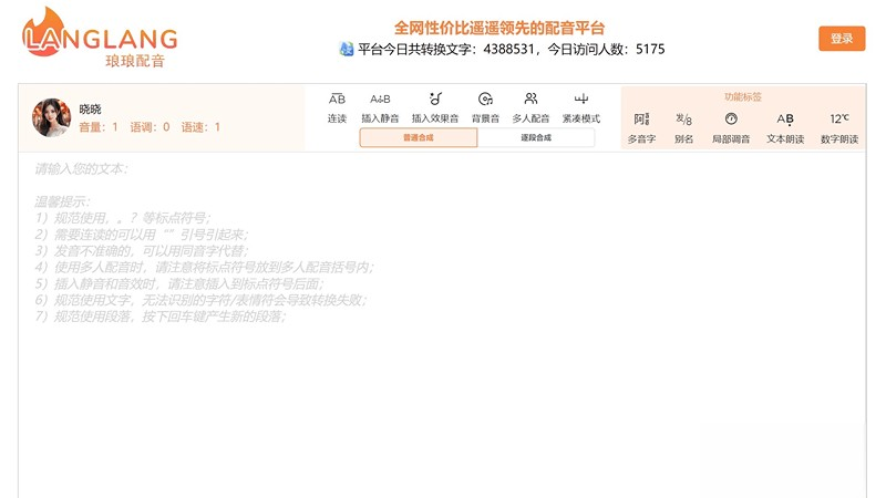 琅琅配音是一款智能文本转语音工具,提供语音合成服务。支持中文、英语、德语、法语等30多种语言,以及高兴、悲伤、兴奋等10多种情感风格。平台功能丰富,操作简单,支持SSML标签,实现多音字、多人配音等高级功能。琅琅配音提供真正的免费版本,晓晓、晓辰、麦克阿瑟、云希、云扬等众多知名AI主播,助您轻松完成视频解说、小说推文或广告宣传,满足不同用户的配音需求,大家快来AI365导航!